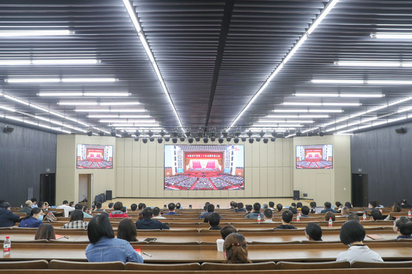 党政领导班子全体成员与全体机关部门干部在图书馆B002共同收看盛会直播,各二级党组织、校团委也组织广大教职工、学生骨干等认真聆听、热议习近平总书记的报告。