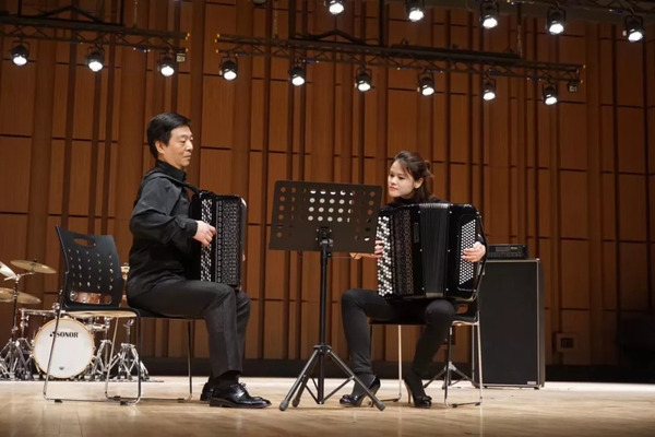 流行音乐系青年教师吴雯怡怀抱巴扬,十指跃动,左臂轻舒拉动风箱,脸露优雅自信的笑容。柔缓的弦乐烘托着巴扬流动的旋律,而巴扬的独特音色映衬着歌手的深情婉唱,珠联璧合,将此曲娓娓道来。